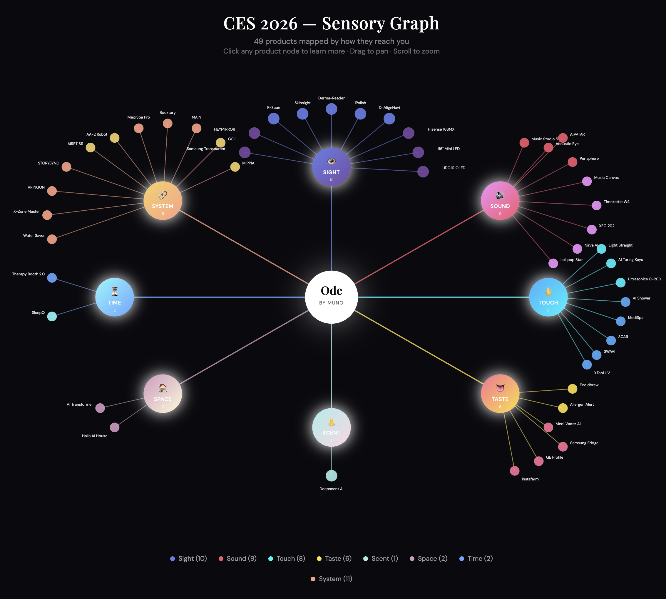 An interactive visualization of 49 products from CES 2026, mapped by how they reach you—through sight, sound, touch, taste, scent, space, time, and the systems that connect them.