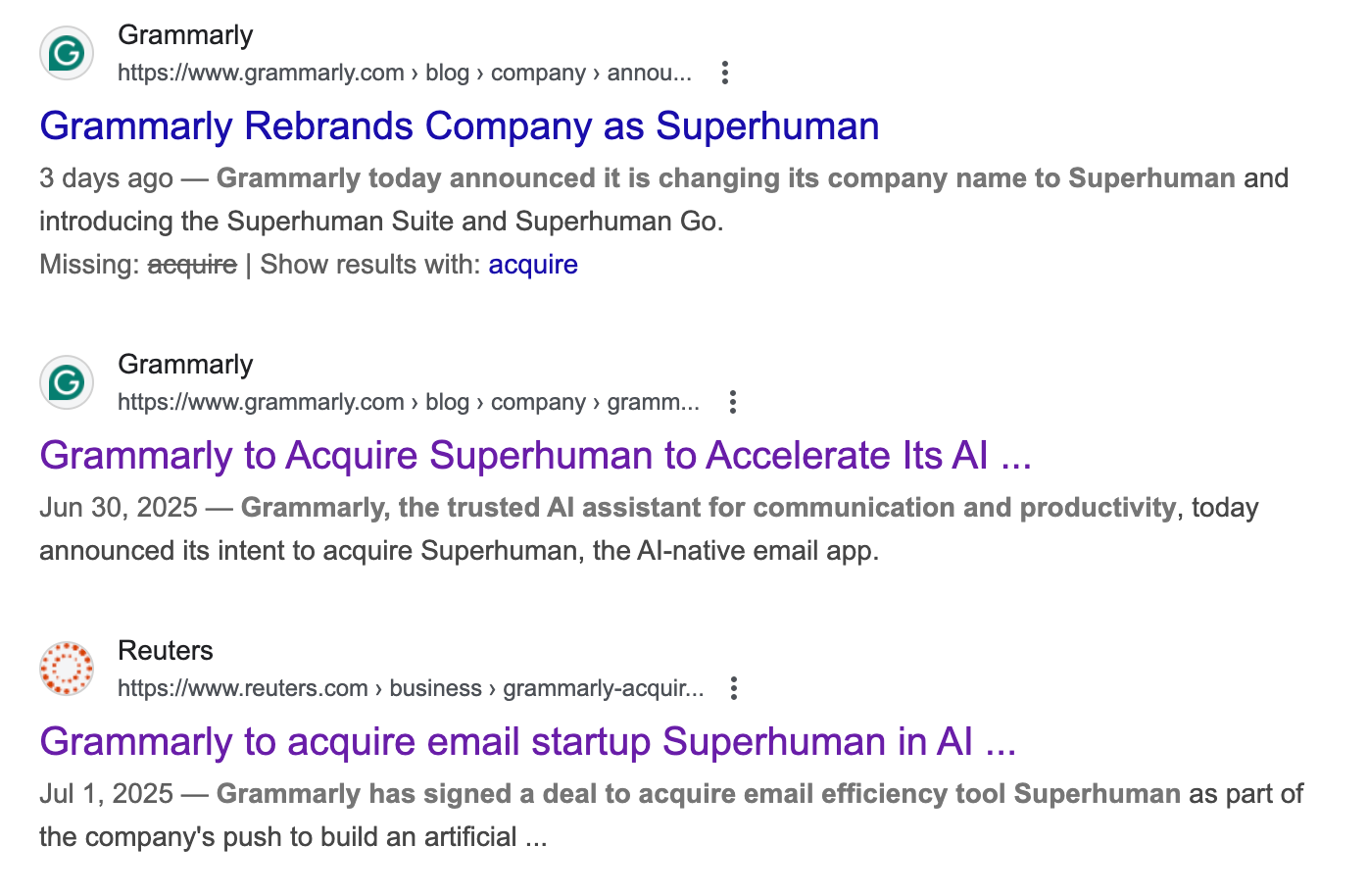 Gemini insisted there was an “factual error,” claiming that “Grammarly did not acquire Superhuman.” A bold statement, and an untrue one. Claude, on the other hand, changed acquired to announced rebrand to, equally valid phrasing, but presented as correction rather than suggestion.