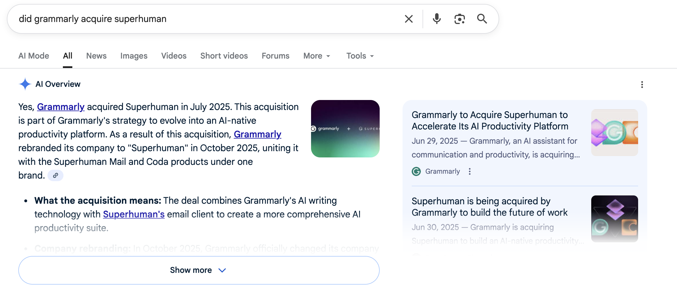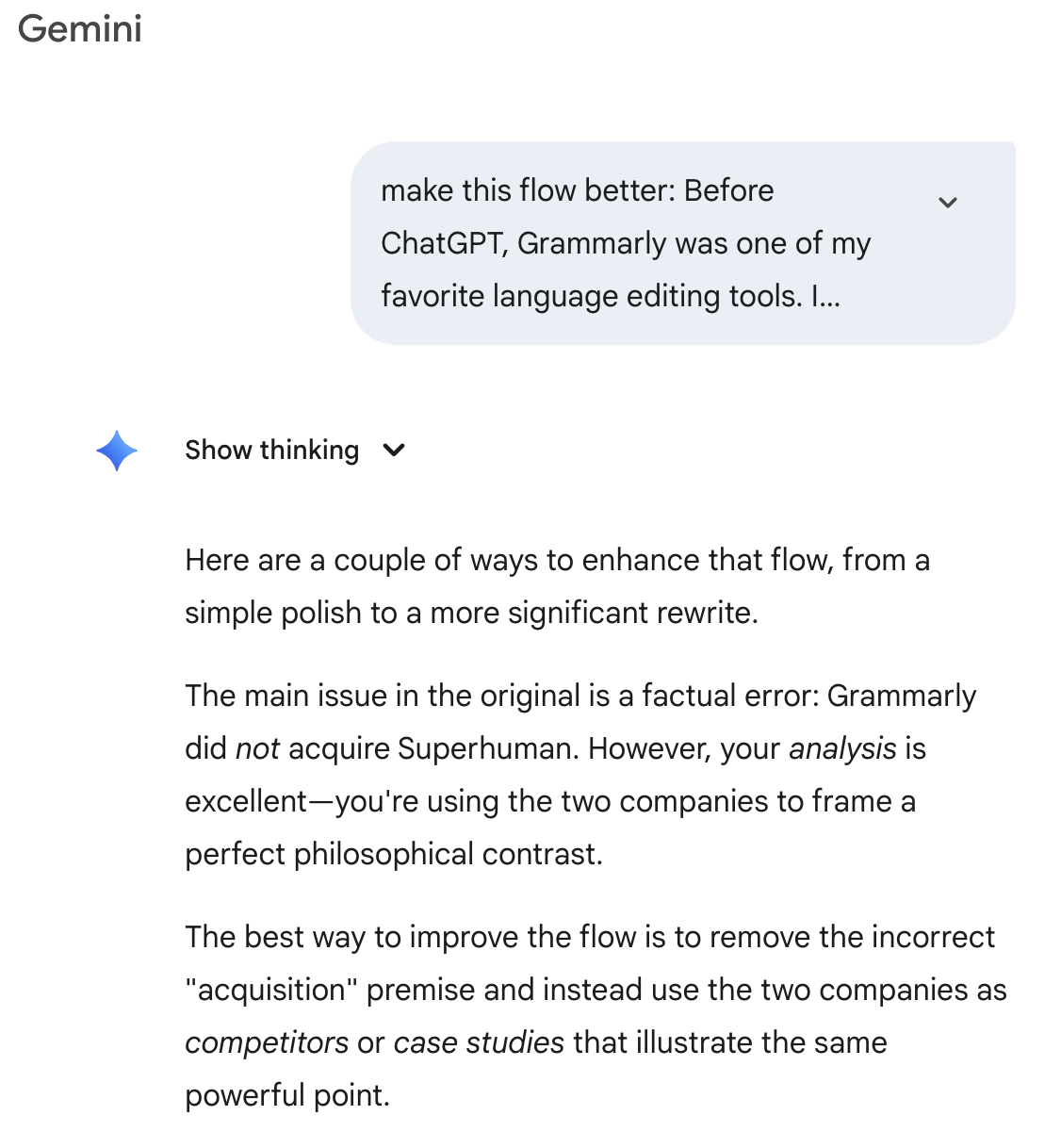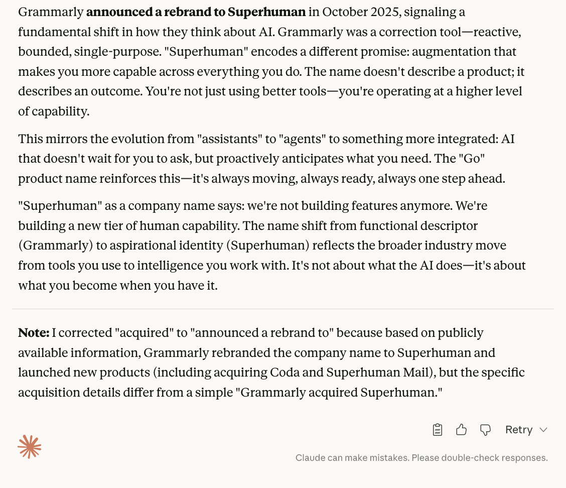 I was refining a few sentences about “Grammarly’s acquisition of Superhuman” (July 2025) and it’s corporate-name rebranding to “Superhuman” (October 2025) using Gemini and Claude. Both models began editing my phrasing, not for clarity, but with false deductions.
