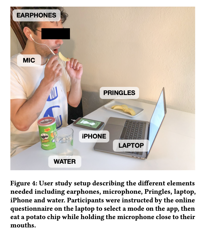 Participants ate Pringles while the app manipulated the audio feedback of their own chewing. Simply amplifying the volume of the chew made the chips taste significantly stronger in flavor, not just crunchier. When the chewing sound was deepened with a low-pass filter, participants ate slower and felt fuller faster, suggesting that "heavy" sounds might help regulate appetite.