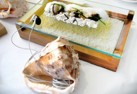 This is perhaps the most famous dish in modern multisensory gastronomy, created by chef Heston Blumenthal at The Fat Duck [5]. The dish is sashimi and "sand" made from tapioca, served on a glass box containing real sand. Diners are given an iPod inside a seashell to listen to crashing waves and seagulls while they eat. "By playing something that is congruent with what you're eating, it enhances the emotion of that dish," Blumenthal explains.