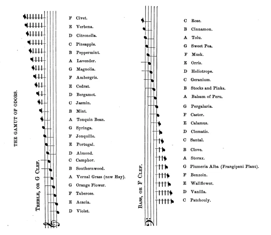 In the 1800s, perfumer Septimus Piesse created a chart mapping scents to musical notes. Sharp, volatile scents like citrus went to high notes. Heavy scents like oud went to low notes. He called it the Odophone.