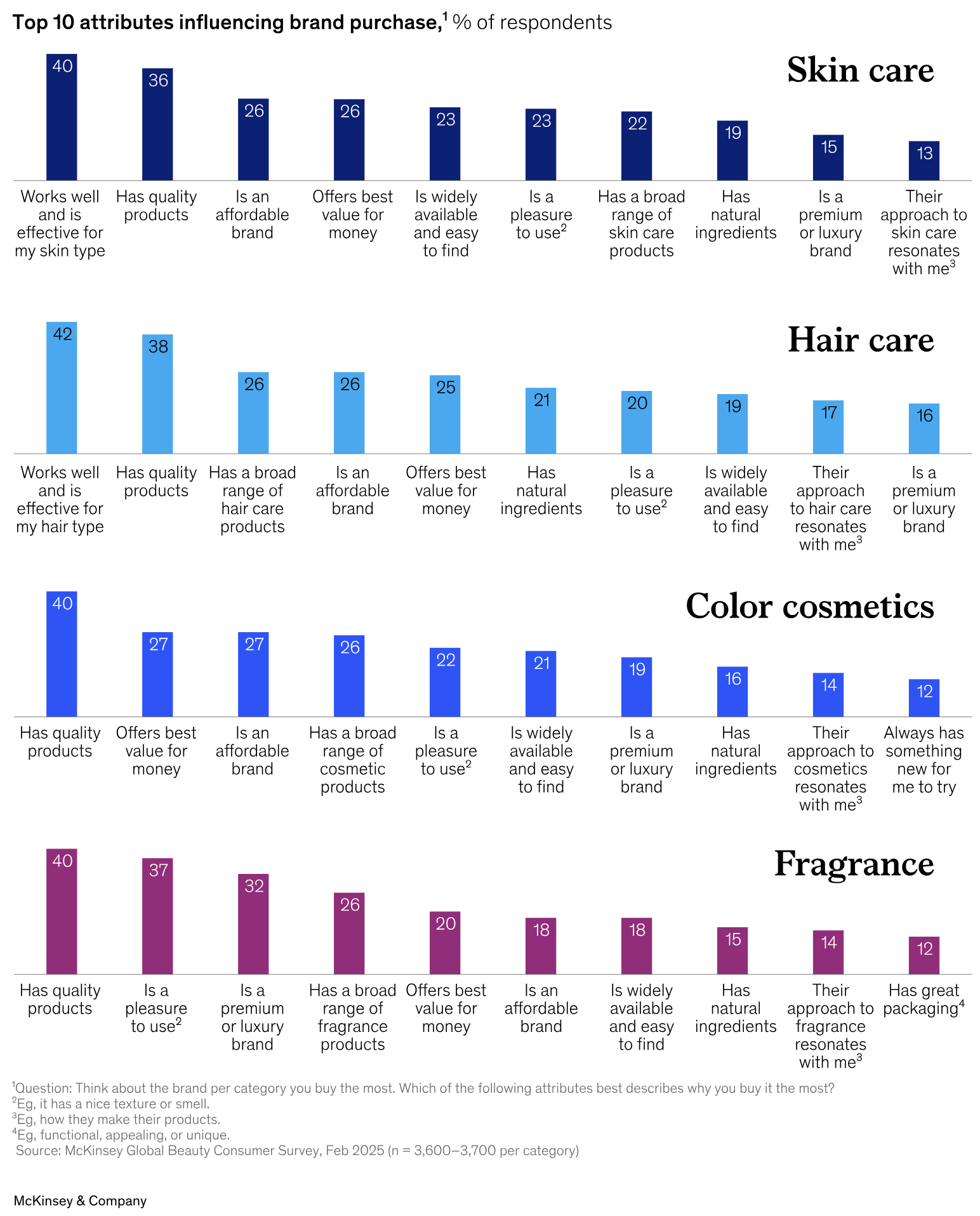 There's something interesting happening in beauty consumer data. When asked what matters most, 40-42% of people say efficacy for their specific type. Quality products come in second at 36-40%. Affordability ranks third.