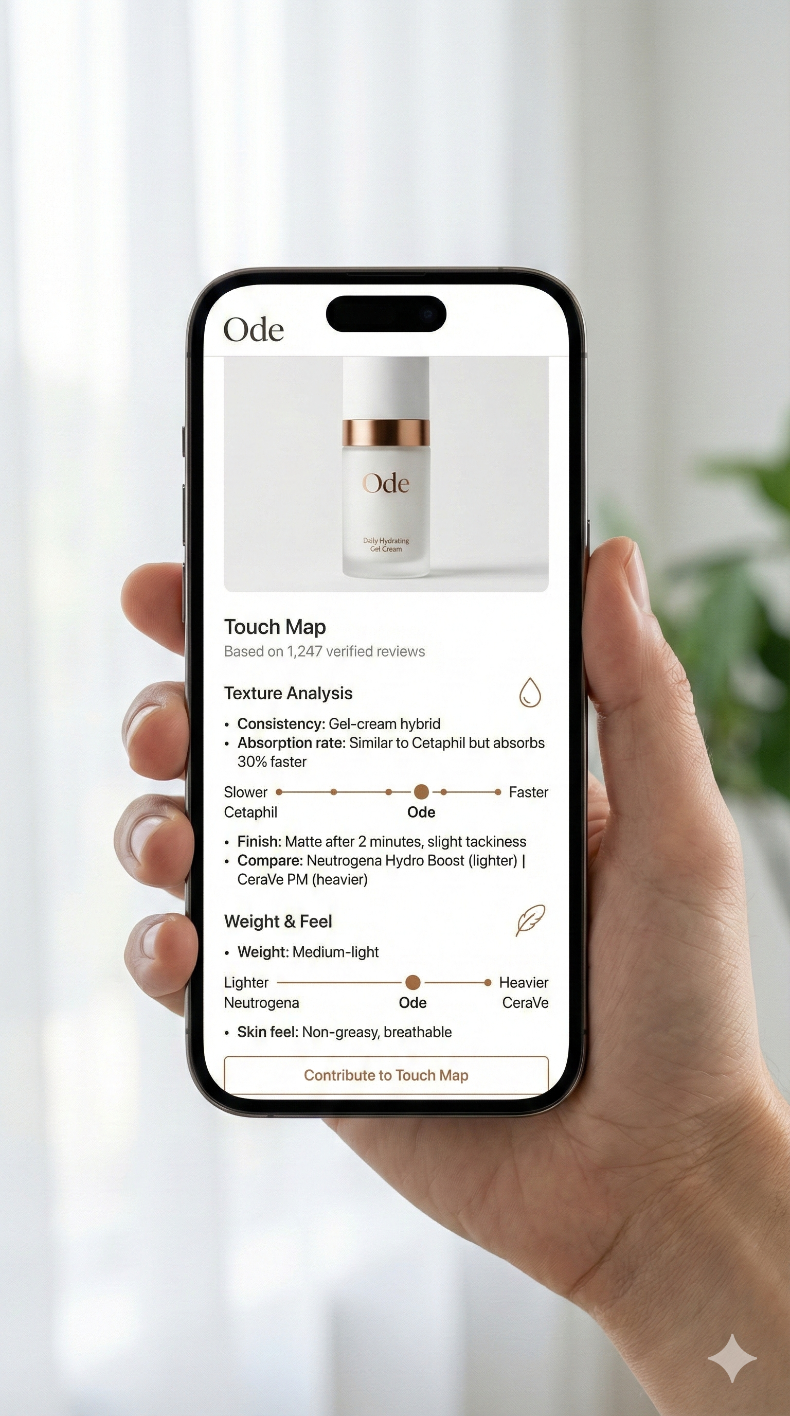 Community-driven texture libraries Imagine a database where people describe products using consistent vocabulary, tagged by skin type and concern. Not "This is amazing!" but "Texture: gel-cream hybrid, absorbs in 45 seconds, slight tackiness for 2 minutes, then matte finish. Comparable to: X, Y, Z." Crowdsourced sensory data that actually helps people predict how something will feel before they buy it.