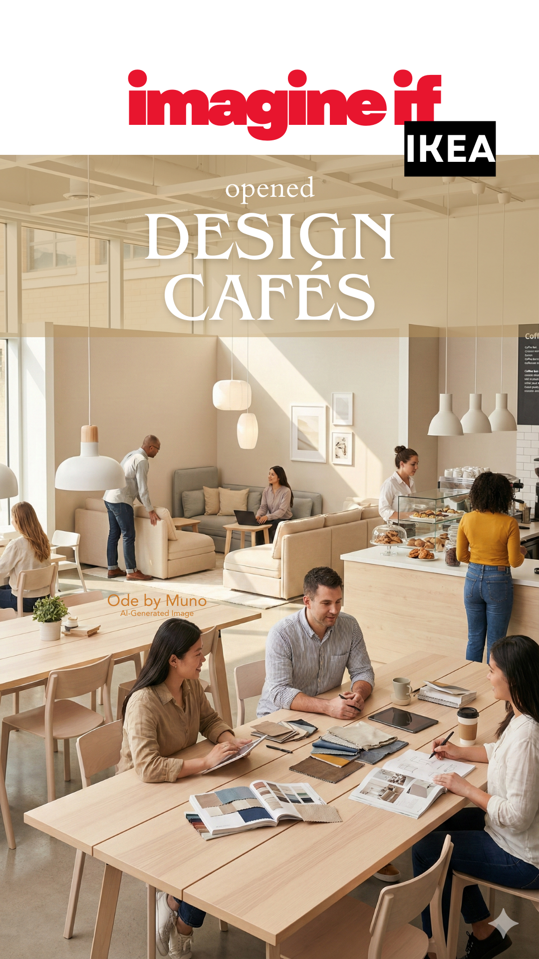 Prompt used to generate image (Gemini Nano Banana Pro): A bright, modern IKEA "design café" inside a showroom. Scandinavian décor with light wood tables, cozy seating, and soft pendant lighting. A coffee bar serving drinks and pastries. Customers rearranging modular sample room furniture, testing layouts, and building moodboards on large tables with fabric swatches, catalogs, and tablets. Small groups of people chatting, sketching, and experimenting with interior ideas. Playful, creative, community-focused energy. Clean architectural lines, neutral tones, warm light. High-resolution, editorial lifestyle photography. Portrait.