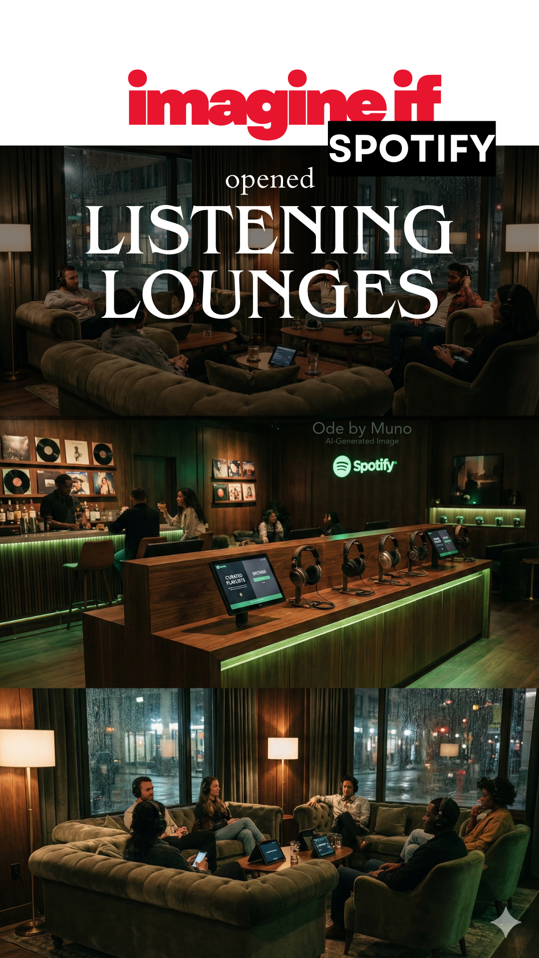 Prompt used to generate image (Gemini Nano Banana Pro): A modern Spotify "listening lounge" in a major city. Cozy oversized couches, soft dim lighting, and warm green accent lights inspired by Spotify's branding. A sleek headphone try-bar with multiple high-quality headphones on display, curated playlist stations, and touchscreens for browsing music. A small bar serving drinks, vinyl displayed on walls, and people in their 20s–40s relaxing, sampling music, chatting quietly. The space feels intimate, stylish, and sound-focused; a social listening room brought to life. High-resolution, moody editorial photography style. Portrait.