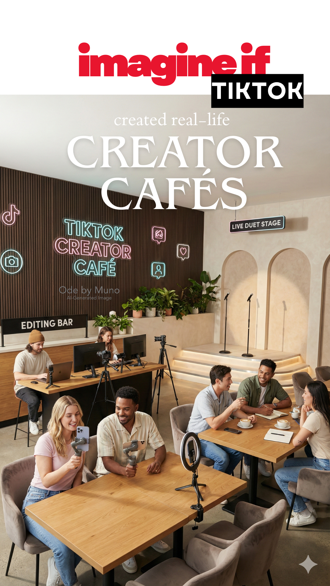 Prompt used to generate image (Gemini Nano Banana Pro): A modern TikTok-style "Creator Café," photographed realistically in soft daylight. Sleek minimalist interior with cozy seating, dark panel walls, warm wood tables, and subtle neon accents in TikTok's signature colors (soft pink, turquoise, black). Visible "editing bars" with ring lights, tripods, and phone stands. A backdrop wall with aesthetic sets for filming (neutral palettes, plants, textured walls). A small stage area for IRL duets. People casually filming, editing, chatting; diverse micro-creators in their 20s and 30s. Latte art, laptops, tripods, and ambient lighting. Clean, bright, inviting atmosphere. High-resolution, editorial style photograph. Portrait.