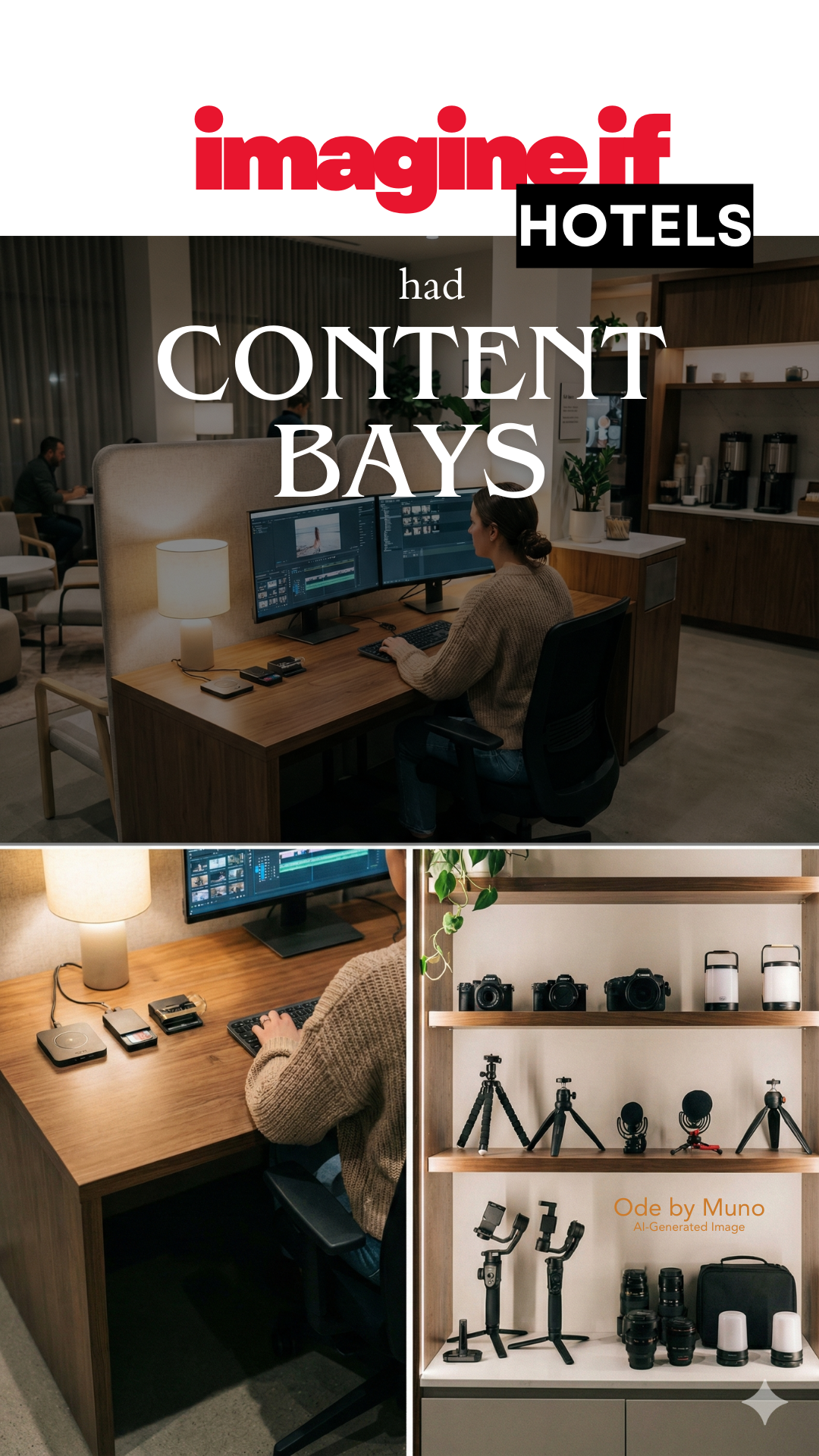 Prompt used to generate image (Gemini Nano Banana Pro): A stylish modern hotel featuring a dedicated "creator edit bay" amenity in a public lounge area. A sleek workstation with soft warm lighting, large high-resolution monitors, charging hubs, USB-C ports, memory card readers, and comfortable ergonomic chairs. Nearby, a neatly organized shelf displays rentable creator gear: cameras, tripods, gimbals, microphones, portable lighting kits. A traveler in casual clothing edits photos or a vlog on the big screen. Minimalist décor, sound-dampening panels, and a small coffee station enhance the calm, productive, travel-friendly atmosphere. High-resolution, lifestyle editorial photography. Portrait.