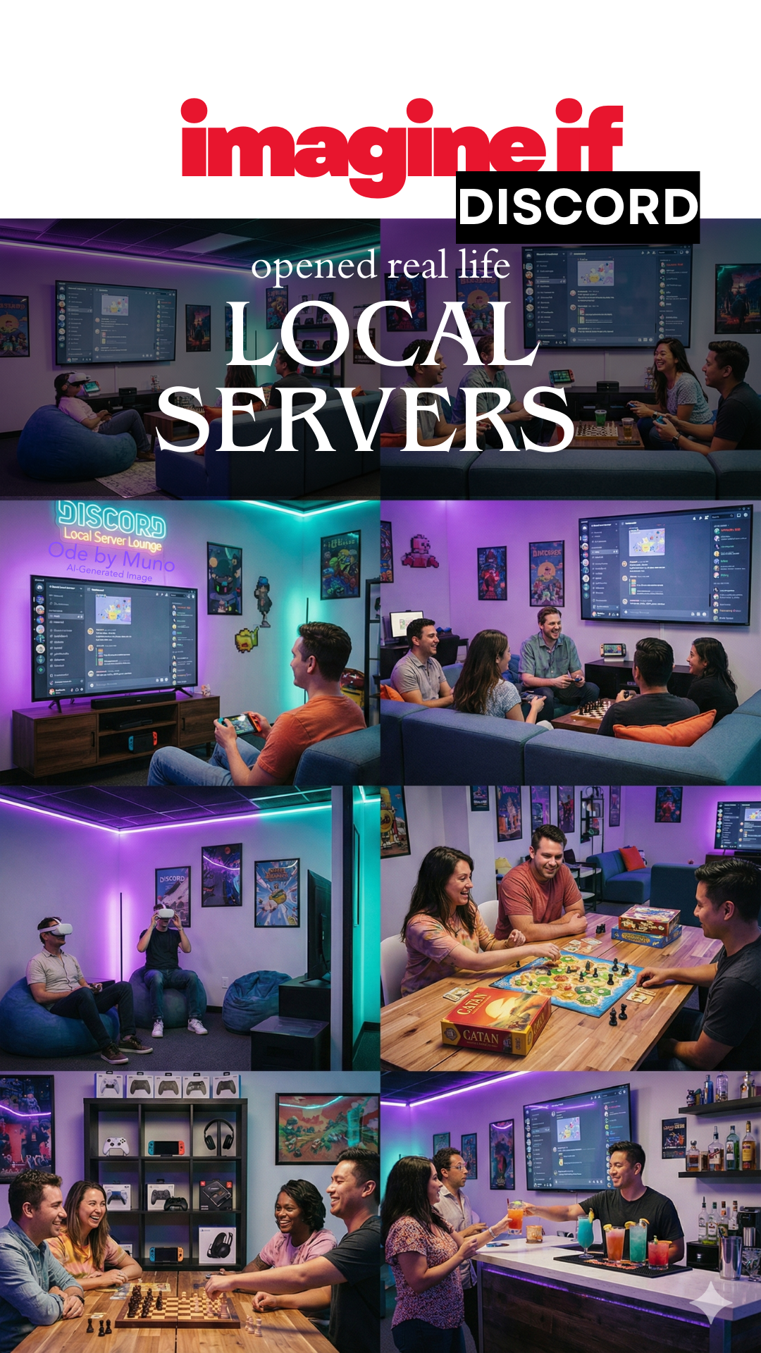 Prompt used to generate image (Gemini Nano Banana Pro): A vibrant "Discord Local Server Lounge" designed purely for fun and IRL community. Soft neon lighting in Discord's purple and teal, cozy modular couches, and playful gaming-inspired décor. Screens on the walls display server avatars, channel names, and scrolling chat animations. Groups of people in their 20s–40s hang out, laugh, and play together, multiplayer video games, VR, Switch battles, and casual tabletop games. A dedicated corner features chess boards, card games, and shelves of board games that people borrow freely. A rental shelf offers gaming gear like controllers, VR headsets, microphones, handheld consoles. A small bar serves colorful drinks and snacks. No one is working; people are playing, chatting, and meeting longtime online friends in person. The vibe is warm, social, and energetic; digital community turned physical. High-resolution, editorial lifestyle photography. Portrait.