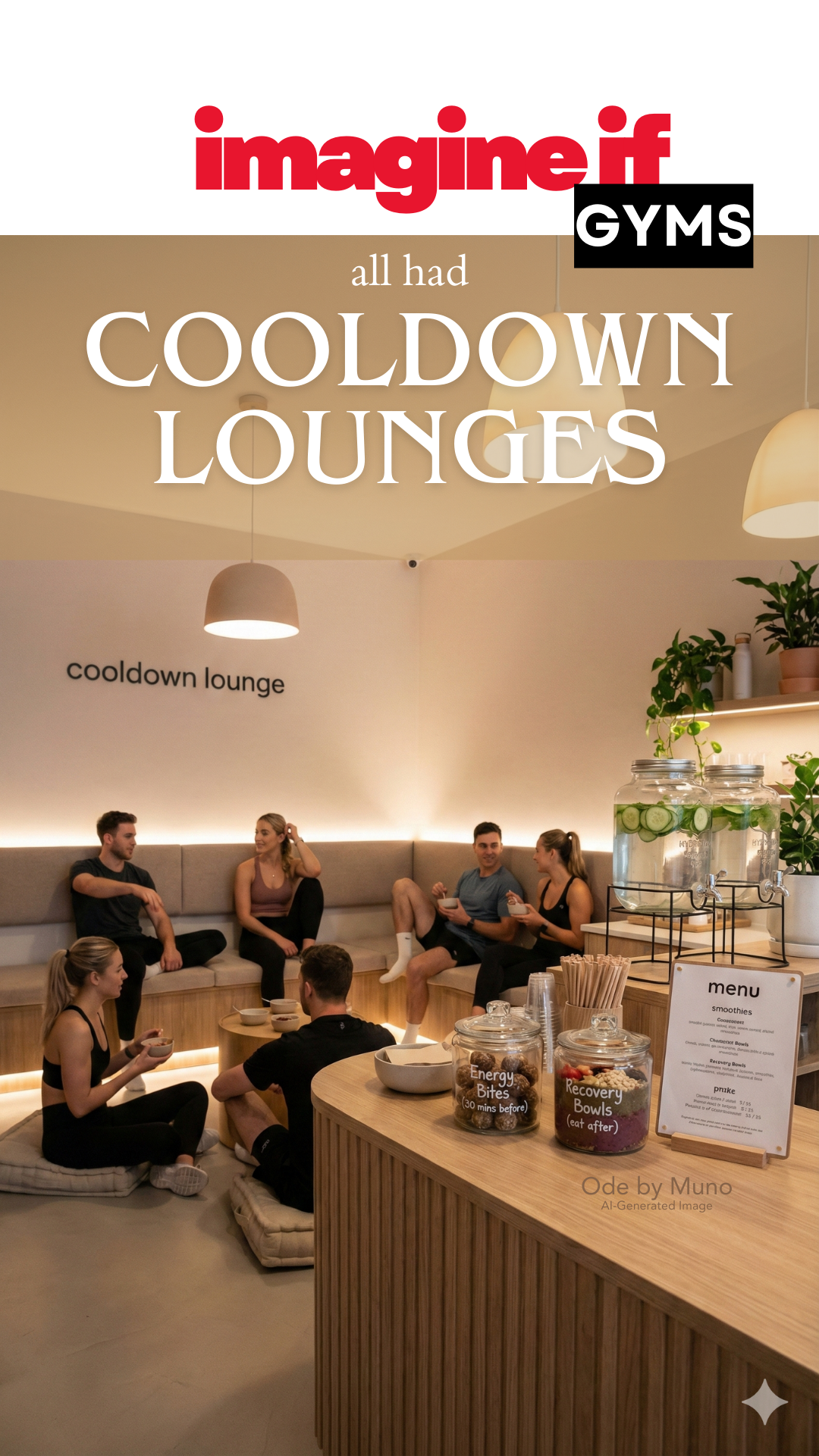 Prompt used to generate image (Gemini Nano Banana Pro): A contemporary fitness studio featuring a dedicated "cooldown lounge" amenity. Soft warm lighting, cushioned benches, and comfortable seating for light stretching and post-class conversations. A smoothie and light protein snack station sits at the center, offering pre-class energy bites (marked "30 minutes before") and post-workout recovery bowls ("eat after") with a small wellness menu encouraging routine-building. A calm hydration area with infused water, plants, and neutral tones completes the space. People in athletic wear relax, chat, stretch, and refuel together. The vibe feels social, restorative, and wellness-centered; a gym designed for connection, not just workouts. High-resolution, lifestyle editorial photography. Portrait.