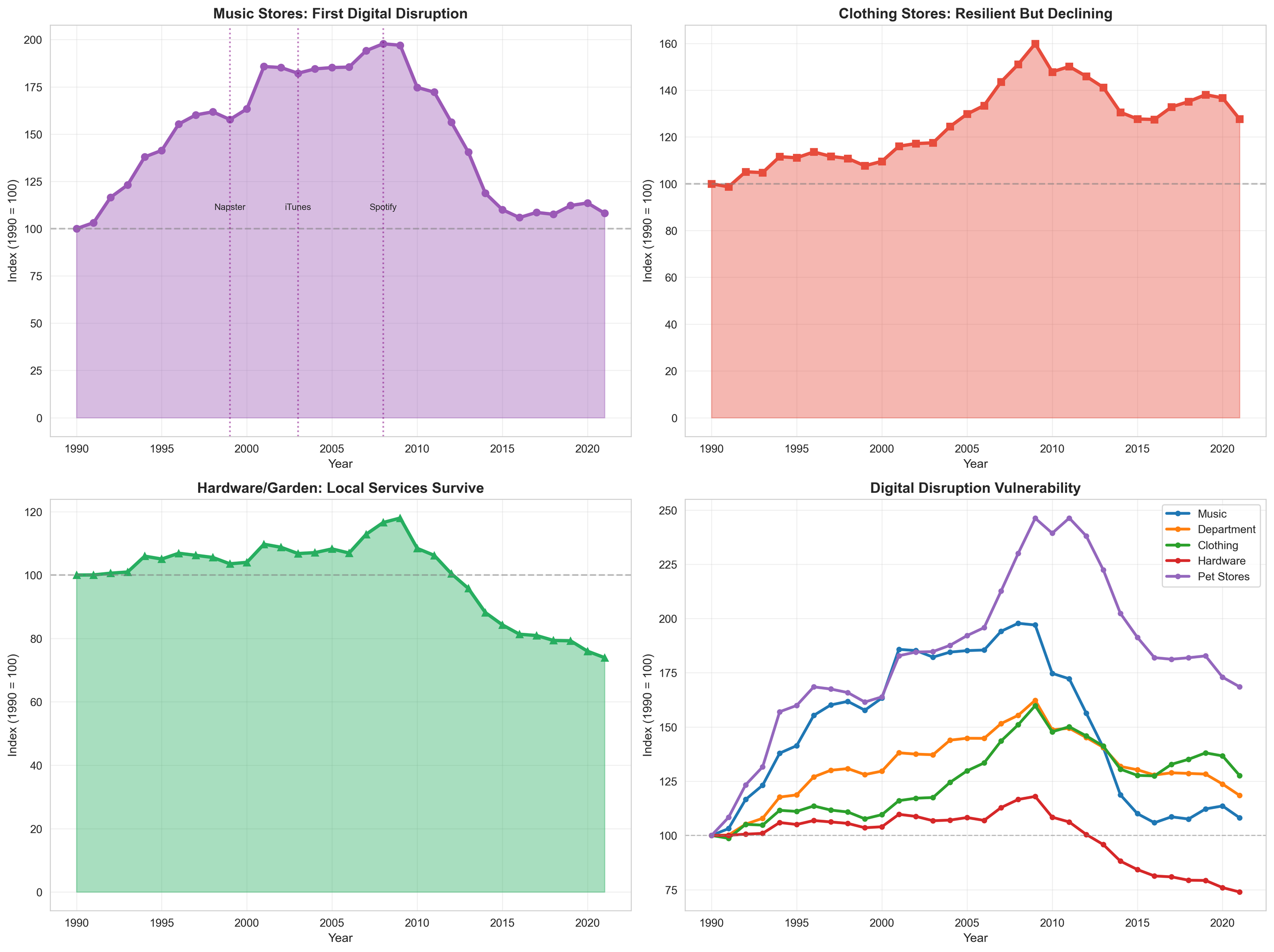 Digital disruption eliminates physical stores when buying is simple: the product is standardized, the risk of a wrong choice is low, and delivery is easier than visiting a store. This is why music, books, and some clothing categories moved online.